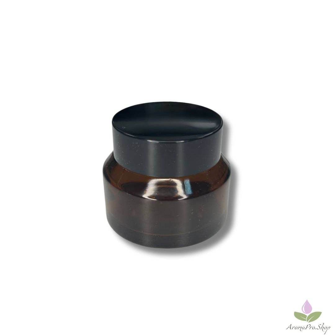 Баночка для крема выполнена из темного стекла. В комплекте мембрана и закручивающаяся крышка (пластик).