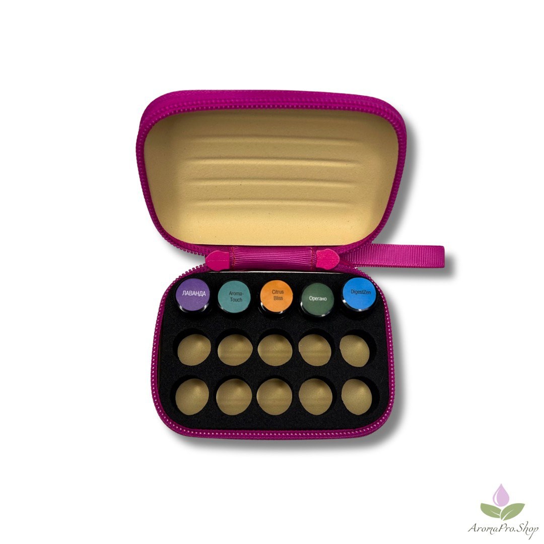 Кейс вмещает в себя 15 пробников эфирных масел по 1, 2 и 3мл.