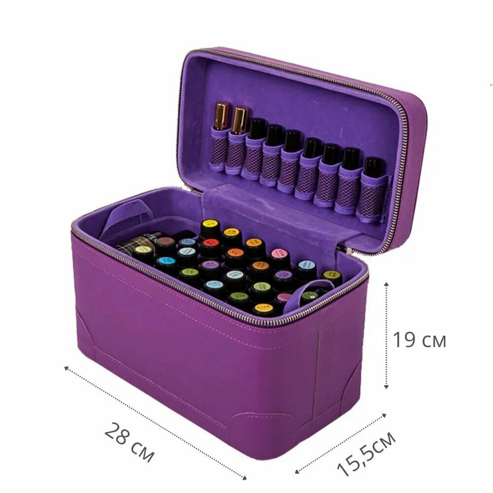 Размеры органайзера составляют 28х19х15 см, что позволяет разместить в нем до 66 бутылочек эфирных масел различных размеров.