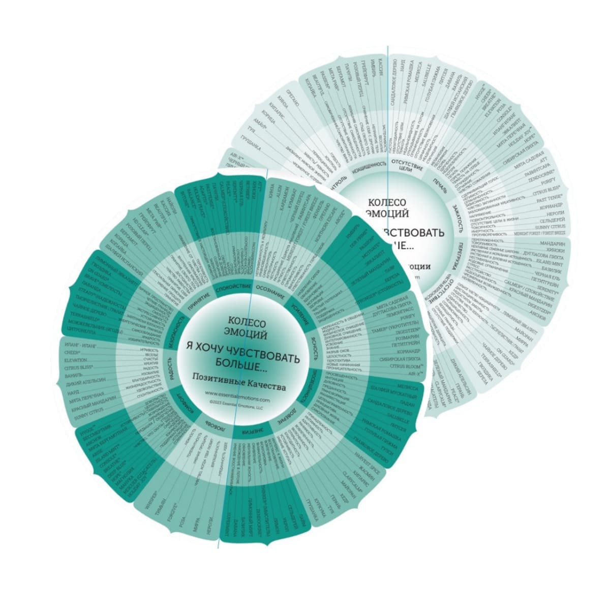 Одна сторона колеса классифицирует и перечисляет положительные эмоции и поддерживающие их эфирные масла. Вторая сторона - отображает отрицательные эмоции и эфирные масла, которые помогают их проработать и отпустить.