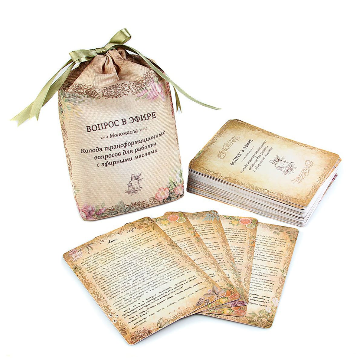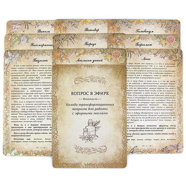 Колода трансформационных вопросов для работы с эфирными маслами "Вопрос в эфире" включает в себя 88 карт (88 моно-ароматов). Эти карты принципиально новый подход работы с эфирными маслами. Это способ заглянуть в глубину себя через тексты, нестандартные вопросы и совместить это с ароматами, которые исцеляют тело, ум и чувства.