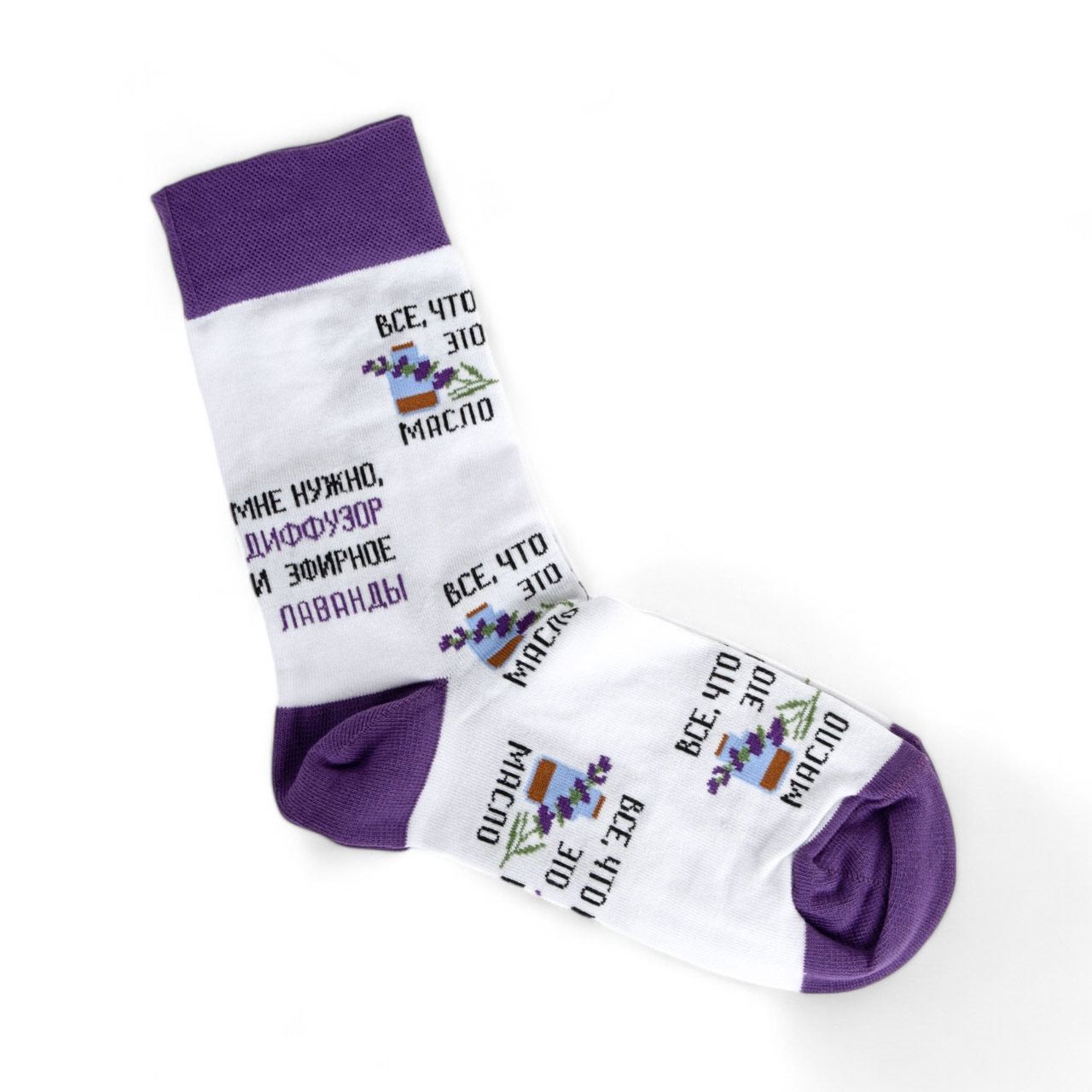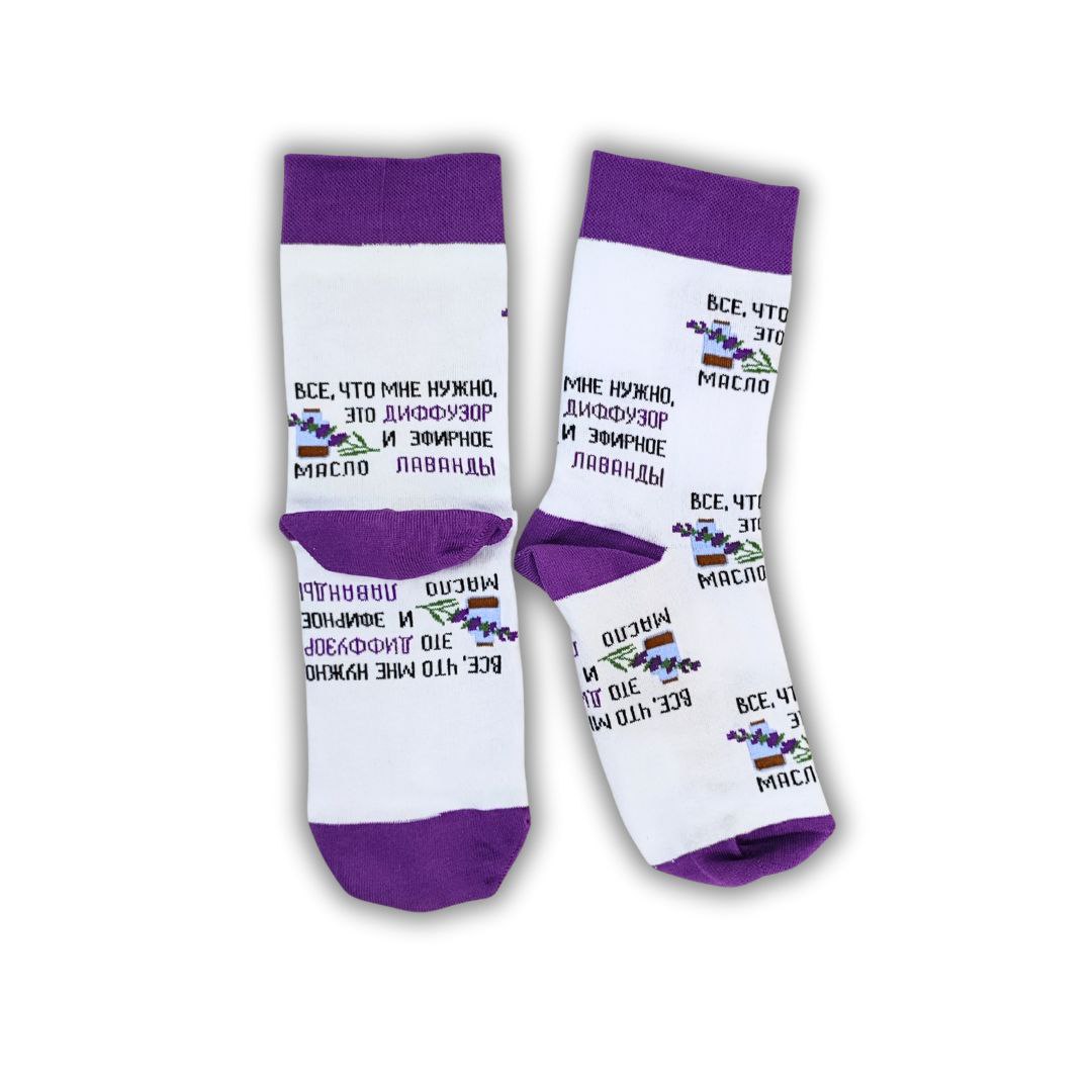Высокие мягкие носки приятно облегают ногу, порадуют поклонников эфирных масел надписью: " Все, что мне нужно, это диффузор и эфирное масло Лаванды"