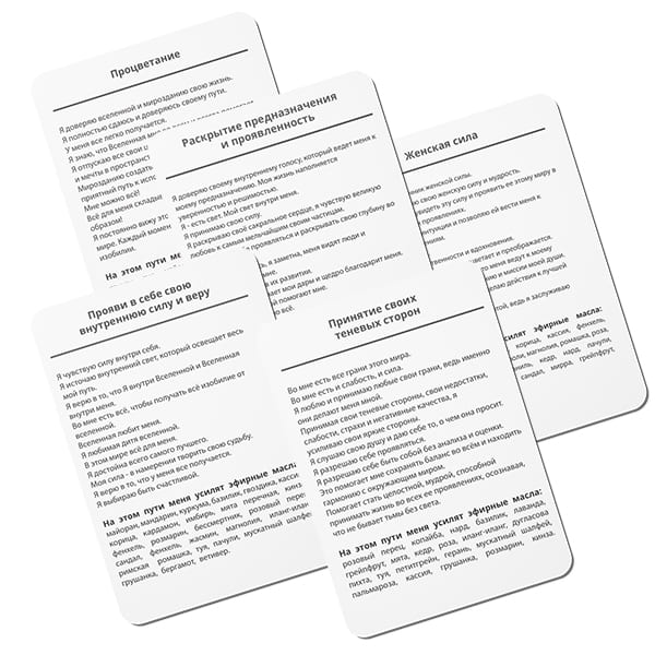 На обратной стороне карты получает энергозагрузку (аффирмации) – это КОДЫ нового времени, установки, которые глубоко загружаются в подсознание и благодаря им, возвращают человека в нужное состояние - он начинает делать новые выборы, легко принимать решения, делать действия. При этом он получает список эфирных масел, которые быстрее легче приведут его к реализации своей цели.