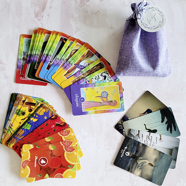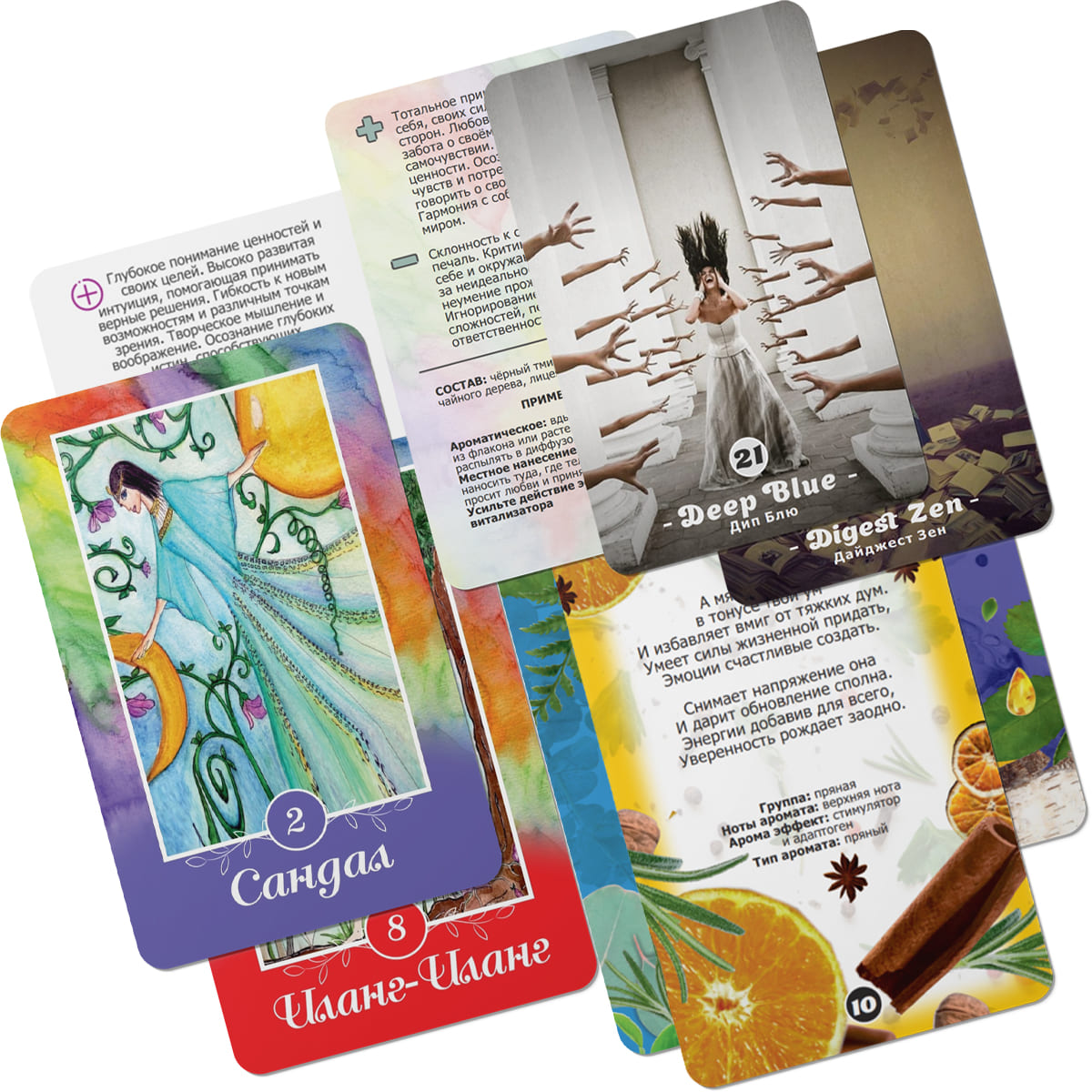 - В игру входит уникальная колода по аромадиагностике. Каждая карта отрисована вручную арт-терапевтом и автором исцеляющих картин - Тианой Сасиной.