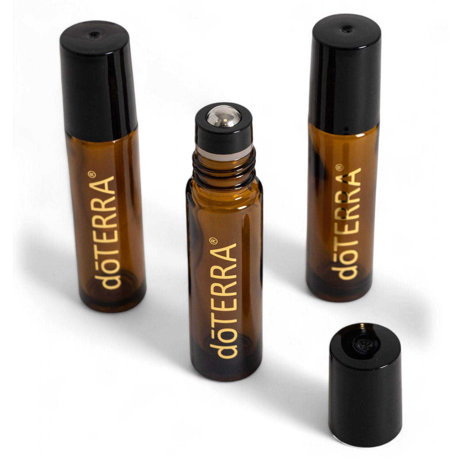 Стильные флаконы ролики из темного стекла с надписью doTERRA.