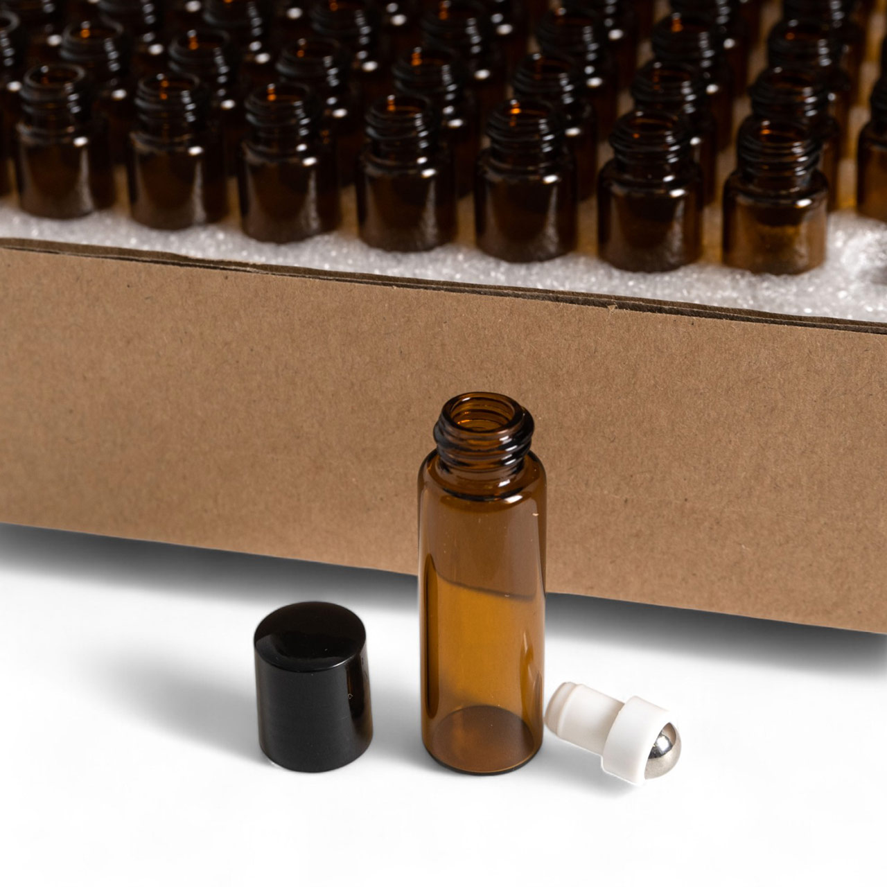 Флакончики из темного стекла с металлическим роликом. Янтарное стекло не пропускает ультрафиолет и защищает эфирное масла от окисления. Идеально подходят для: