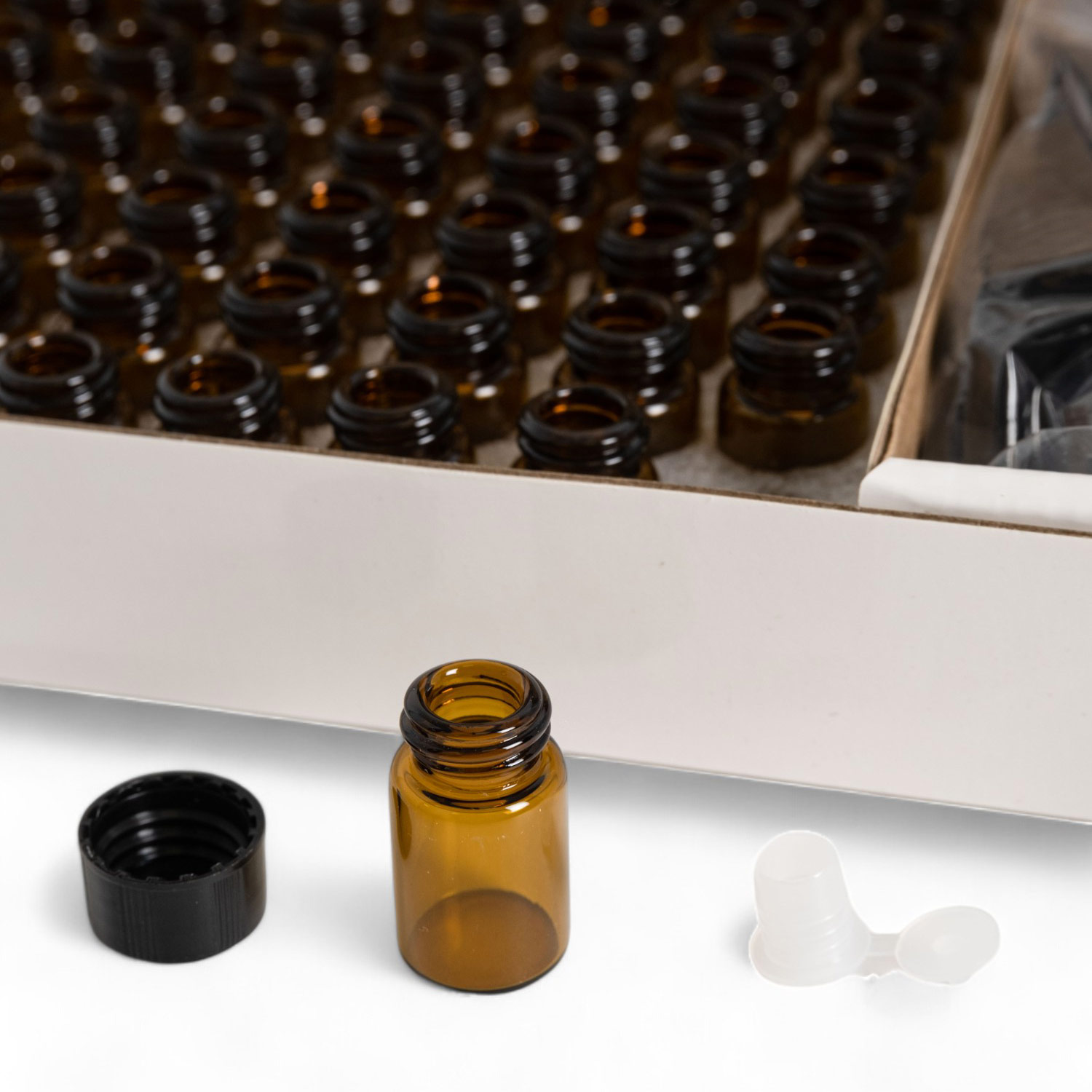 Набор флаконов пробников из темного стекла c герметичной насадкой-дозатором с заглушкой из пластика и винтовой крышкой. что обеспечивает плотное закрытие, а значит предотвращает подтекание и окисление.