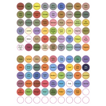 38 стикеров с названием смесей эфирных масел на английском языке: