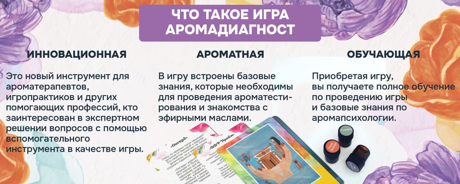 Трансформационная Игра Аромадиагност - это инновационный инструмент для ароматерапевтов, игропрактиков и других экспертов, кто заинтересован в экспертном решении вопросов с помощью игры.